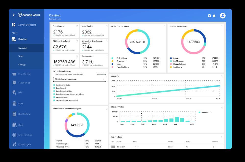 Actindo übernimmt zentrale ERP-Funktionen – inklusive Warenwirtschaft, Reorder Management, Zahlungsabwicklung und Debitorenbuchhaltung. Gleichzeitig steuert ihr alle Order-Flows kanalübergreifend.
